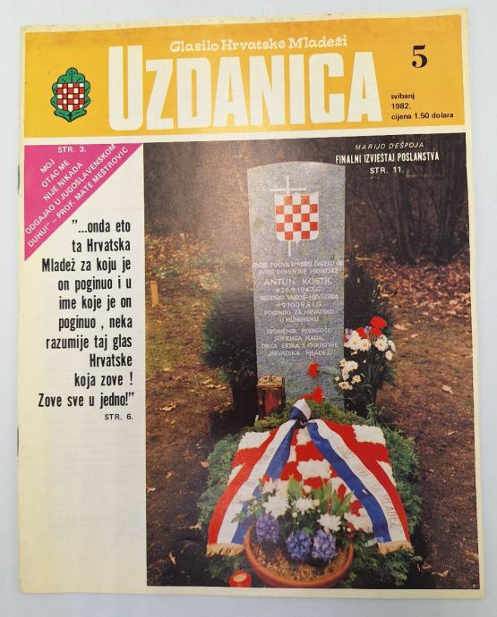 Uzdanica br. 5/1982. (emigracija)glasilo hrvatske mladeži Odgovorni urednik: Ante SarićStranica: 24Dimenzije: 22x28Jezik: AustralijaPismo: LatinicaStanje: Vrlo dobroUvez: MekiGodina: 1982