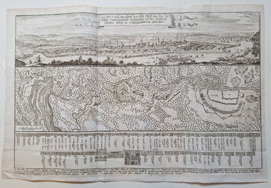 Matthaus Merian: Veduta Osijek-Prospect und Grundriss der Stadt Osseck, wie die Turkische Armee sich dafür verschanzt und die christiche Armee dabei in SchlachtVeduta se sastoji iz 3 dijela. Na gornjoj trećini nalazi se veduta grada Osijeka iz poluptičje perspektive i vide se obrambeni zidovi te mnogobrojni minareti i kuće grada. Srednja trećina prikazuje zemljovid močvarnog područja oko grada, rijeku Dravu i plan grada sa svim utvrdama, donja trećina prikazuje raspored austrijske carske vojske, koja je pod vodstvom Karla Lotaringijskog 1687. opsjedala grad. Hrvatske trupe su na krajnjem desnom krilu. Karlo Lotaringijski nije tom prilikom uspio osvojiti Osijek, ali je pri povlačenju teško porazio tursku vojsku pod Sulejman-pašom, koja je krenula za njim, te tako omogućio osvajanje Osijeka nekoliko mjeseci kasnije. Ta pobjeda odjeknula je cijelom Europom, jer je Osijek bio značajno strateško mjesto, i prouzročila je tiskanje mnogobrojnih opisa, veduta i letaka.MERIAN, MATTHÄUSMATTHÄUS MERIAN (1593-1650) njemački topograf, grafičar i izdavač. Studirao je u Zürichu, a radio u Frankfurtu. Njegovo najpoznatije djelo je “Theatrum Europeam..” koje je u razdoblju od 1629. do 1718. doživjelo više izdanja te “Archontologica Cosmica” također s više izdanja izdatih u razdoblju od 1638. do 1649. Stranica: 1Dimenzije: 52x37Jezik: NjemačkaPismo: GoticaStanje: Vrlo dobroUvez: MekiGodina: 1698