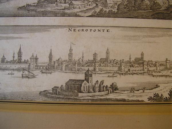 Matthaus Merian: Veduta Ragusa i Negroponte Topograf, bakrorezac i nakladnik (1593 - 1650). Studirao je u Zurichu, a radio u Frankfurtu na Maini. Najpoznatije njegovo djelo sustavna je zbirka planova i panorama gradova pod nazivom Theatri Europei Oder Historische Beschrei Vornemdsten und denckwurdigsten Geschichten, so sich hin weider in Europa sonderlich im Reic Nation von Anno 1642 bis Anno 1647. U razdoblju od 1629. do 1718. to je djelo doživjelo više izdanja. Archeologica Cosmica njegovo je djelo koje je također doživjelo više izdanja u razdoblju od 1638. do 1649. Poznat je i po svojoj Topographia Provinciarum Austriacarum objavljenoj 1649. u Frankfurtu na Maini. Bio je vrlo cijenjen graver i izdavač velikog broja različitih knjiga i tiskovina. Autor je predivnih opisa biljaka i cvijeća koje koriste u medicini objavljenih u knjizi Die fruchbringede Gesellschaft 1646. godine u Frankfurtu na Maini. Theatri Europei sadrži i karte hrvatskih područja, npr. vedutu Senja, kartu okolice Klisa i Splita ili kartu zadarsko - šibenskog zaleđa. Posljednju kartu izradio je u koautorstvu s Natalom Bonifacijom, a jedan njezin primjerak čuva se u Sveučilišnoj knjižnici u Splitu. Pored nje tamo se može naći i njegova karta Ragvsa.Dimenzije: 31.5x21.5Jezik: Njemačka