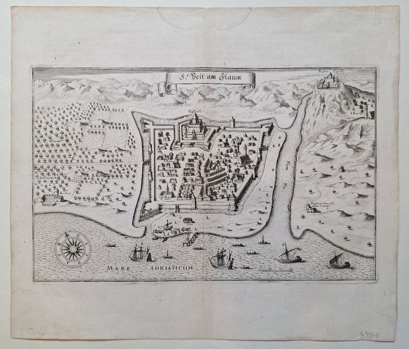 Matthaus Merian- Veduta Rijeke / St. Veit an Flaum Ova Merianova veduta grada Rijeke objavljena je u Merianovom djelu "Theatri Europei Oder Historische Beschreibung aller Vornemdsten und denckwurdigsten Geschichten, so sich hin weider in Europa sonderlich im Reich Teucher Nation von Anno 1642 bis Anno 1647.". Merianova veduta nastala je tameljem slične Coronellijeve toga grada. Težište prikaza sastavljeno je na fortifikacijski sustav grada Rijeke. Grad je imao tlocrt nepravilnoga četverokuta. Gradski kaštel znatno je predimenzioniran a prostorni raspored pojedinih gradskih palača nije vjerno prikazan. Vodeni jarci oko grada takoðer nisu postojali. Lijevo od utvrðenog grada protječe Rječina iznad koje se izdiže Trsat sa svojom utvrdom. Lijevo od grada prikazani su gradski vrtovi. Reljef je naznačen vrlo shematizirano, sjenčanim krtičnjacima. Od starih utvrda grada Rijeke, danas je sačuvano vrlo malo. Svakako najpoznatiji svjedok tih vremena predstavljaju morska gradska vrata nad kojima je toranj sa satom, danas jedan od najpoznatijih simbola grada Rijeke. Matthaus Merian (1593-1650) njemački topograf, grafičar i izdavač. Studirao je u Zurichu, a radio u Frankfurtu. Njegovo najpoznatije djelo je "Theautrum Europeam..." koje je u razdoblju od 1629. do 1718. doživjelo više izdanja te "Archeologica Cosmica" takoðer s više izdanja izdatih u razdoblju od 1638. do 1649. Stranica: 1Dimenzije: 37x31.5Jezik: NjemačkaStanje: Vrlo dobroUvez: MekiGodina: 1650
