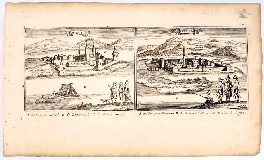 List se sastoji od dvije vedute. panoramska veduta sisačke utvrde (Sisect)srednjovjekovne utvrde Petrinja (Petrinia).Naglasak je na fortifikacijskim elementima i izgledu građevina.nemaren. Tekst legende objašnjava smještaj čvrste utvrde Sisak na uskom prostoru između Save i Kupe; A. de Sterckte Siseck B. de Rivier Kulp. C. de Rivier Sauw.Ova Petrinja prikazana u vrijeme kad je bila pod Osmanskom vlašću, dakle prije 1595. godine. Ispod vedute je također legenda simbola s karte koja objašnjava položaj utvrde između Kupe i Petrinjčice: A. de Sterckte Petrinia B. de Rivier Petrinia. C. de Rivier de Culpa. Vedute je u bakrene ploče ugravirao Gaspar Bouttats, poznat po visokoj likovnoj vrijednosti kartografskog materijala. Ova karta dio je serije Peetersovih veduta koje prikazuju lokalitete koji su nizozemskim kartografima bili važni u habsburško-osmanskim ratovima između 1683. i 1699. godine. Peeters, Jacques (1637-1695) - izdavač i bakrorezac koji je tijekom 17. stoljeća djelovao u Antwerpenu. Najpoznatije djelo Peetersa je “L' Atlas en abrége“ koje je doživjelo više izdanja.Stranica: -Dimenzije: 28.5x17.5Jezik: AntwerpenPismo: LatinicaStanje: OdličnoUvez: MekiGodina: 1686