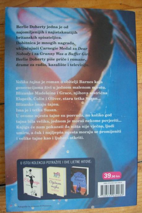 Berlie Doherty jedna je od najomiljenijih i najistaknutijih britanskih spisateljica za mlade. Dobitnica je mnogih nagrada, uključujući Carnegie Medal za Dear Nobodyi za Granny Was a Buffer Girl. Berlie Doherty piše i za odrasle, kao i drame za radio, kazalište i televiziju. Velika tajna je roman o obitelji Barnes koja generacijama živi u jednom malenom mjestu. Blizanke Madeleine i Grace, njihova sestrična Elspeth, Colin i Oliver, stara tetka Susan... Blizanke imaju tajnu. Ima je i tetka Susan. U ovome mjestu tajne su posvuda, no koliko god tajna bila velika, jednom je moraš nekome povjeriti... Knjga će nam pokazati da ništa nije vječno, ljudi umiru, a čak i najljepša mjesta moraju se promijeniti i velike tajne kao i ljubavi otkriti.