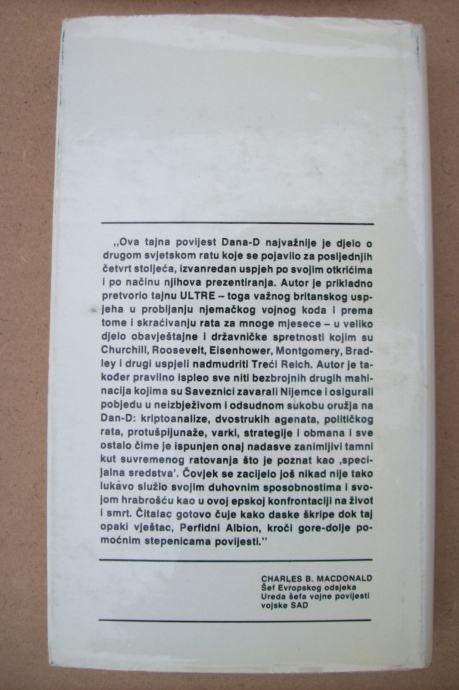 Ova tajna povijest Dana-D najvažnije je djelo o drugom svjetskom ratu koje se pojavilo za posljednjih četvrt stoljeća, izvanredan uspjeh po svojim otkrićima i po načinu njihova prezentiranja. Autor je prikladno pretvorio tajnu ULTRE-toga važnog britanskog uspjeha u probijanju njemačkog vojnog koda i prema tome i skraćivanju rata za mnoge mjesece - u veliko djelo obavještajne i državničke spretnosti kojim su Churchill, Roosevelt, Eisenhower, Montgomery, Bradley i drugi uspjeli nadmudriti Treći Reich. Autor je također pravilno ispleo sve niti bezbrojnih drugih mahinacija kojima su Saveznici zavarali Nijemce i osigurali pobjedu u neizbježivom i odsudnom sukobu oružja na Dan-D: kriptoanalize, dvostrukih agenata, političkog rata, protušpijunaže, varki, strategije i obmana i sve ostalo čime je ispunjen onaj nadasve zanimljivi tamni kut suvremenog ratovanja što je poznat kao .specijalna sredstva'. Čovjek se zacijelo još nikad nije tako lukavo služio svojim duhovnim sposobnostima i svojom hrabrošću kao u ovoj epskoj konfrontaciji na život i smrt. Čitatelj gotovo čuje kako daske škripe dok taj opaki vještac, Perfidni Albion, kroči gore-dolje pomoćnim stepenicama povijesti.