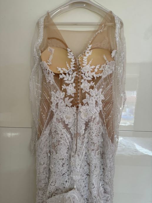Prodajem novu vjenčanicu brenda Vesna Sposa. Haljina je raskošnog dizajna s detaljnom čipkastom aplikacijom u bijeloj boji na nude podlozi, s dugim rukavima od prozirnog tila ukrašenog šljokicama. Kroj je pripijenjen uz tijelo u stilu mermaid, a cijela haljina odiše elegancijom i luksuzom. Dolazi s originalnom zaštitnom vrećom brenda Vesna Sposa.