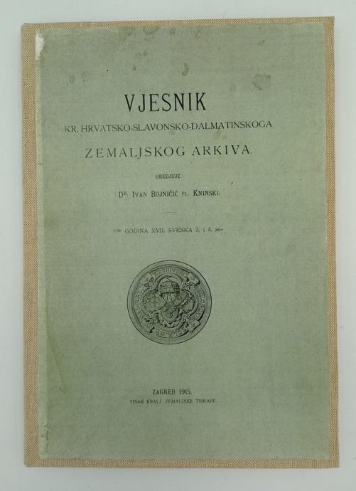 Vjesnik kr. hrvatsko-slavonsko-dalmatinskoga zemaljskog arkiva, godina XVII. sveska 3. i 4.Stranica: 352Dimenzije: 19x27Jezik: ZagrebPismo: LatinicaStanje: DobroUvez: TvrdiGodina: 1915