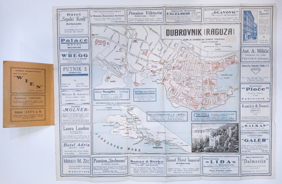 Vodja kroz Dubrovnik i okolicu sa planom,Dubrovnik plan je izrađen na osnovu podataka 1923.g. / uredio P. E. Navojev.mjerilo: 1:2 778Stranica: /Dimenzije: 39x34Jezik: BeogradPismo: LatinicaStanje: Vrlo dobroUvez: MekiGodina: 1923