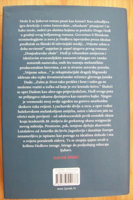 Može li se ljubavni roman pisati kao krimić? Kao uzbudljiva igra detekcije s onim žanrovskim „whodunit“ pitanjem? Itekako može, sudeći po alatima kojima se poslužio Drago Hedl u gradnji ovog briljantnog romana. Govorimo li filmskom terminologijom (a nova je Hedlova ispovjedna proza idealan predložak za filmski ili televizijski medij), Vrijeme seksa u doba nevinosti uspješan je sequel njegova prvog romana Donjodravska obala. Hedl je vrhunskim umijećem i iskričavim stvarateljskim zanosom izbjegao sve zamke notornih nastavaka, onih što nastaju mehaničkim producentskim hirovima, a ne iz stvarne autorske potrebe.