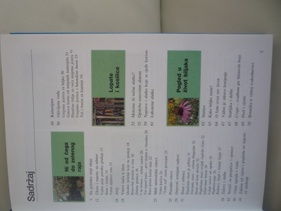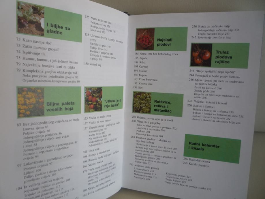 Praktična knjiga, brojne fotografije u boji, savjeti i upute u svezi s vrtom: od njegova planiranja, preko obrade tla, gnojenja, njege biljaka i svih važnijih poslova u voćnjaku, povrtnjaku i cvijetnjaku. 263 stranice.