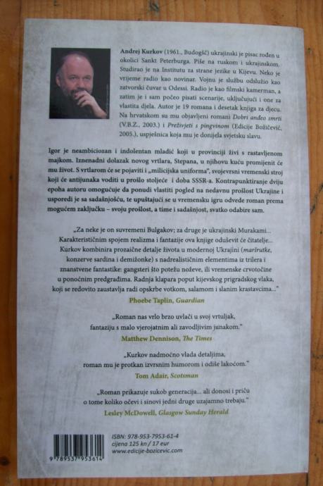 Andrej Kurkov (1961., Budogšč) ukrajinski je pisac rođen u okolici Sankt Peterburga. Piše na ruskom i ukrajinskom. Studirao je na Institutu za strane jezike u Kijevu. Neko je vrijeme radio kao novinar. Vojnu je službu odslužio kao zatvorski čuvar u Odessi. Radio je kao filmski kamerman, a zatim je i sam počeo pisati scenarije, uključujući i one za vlastita djela. Autor je 19 romana i desetak knjiga za djecu. Na hrvatskom su mu objavljeni romani “Dobri anđeo smrti” (V.B.Z., 2003.) i “Preživjeti s pingvinom” (Edicije Božičević, 2005.), uspješnica koja mu je donijela svjetsku slavu.