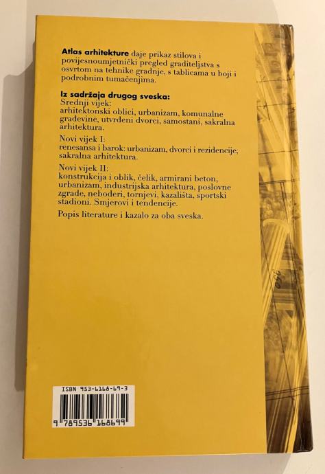 Poznati dtv-ov Atlas arhitekture pojavljuje se prvi put u hrvatskome izdanju, koje je priređeno prema 11. izd. Iz 1997. (I.), odnosno 10. izd. Iz 1997. (II.), u izdanju Deutscher Taschenbuch Verlaga iz Münchena. Atlas arhitekture uvodi čitatelja u sadržaj i povijest graditeljstva, pristupajući mu sa stajališta povijesti umjetnosti. Prvi dio obuhvaća povijest graditeljstva od Mezopotamije do Bizanta, a drugi od romanike do današnjih dana. Jedinstvo slikovnoga materijala i teksta čini knjigu istraživačkom studijom, ali i visokoškolskim udžbenikom te priručnikom za različite korisnike.