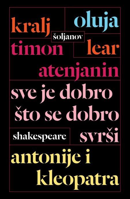 Pet djela Williama Shakespearea u prijevodu Antuna Šoljana: Oluja · Antonije i Kleopatra · Kralj Lear · Timon Atenjanin · Sve je dobro što se dobro svrši, prava su književna poslastica. Velike tragedije Kralj Lear, Antonije i Kleopatra i Timon Atenjanin, mračna komedija Sve je dobro što se dobro svrši i zagonetna romanca Oluja spadaju u sam vrh ostvarenja velikog engleskog dramatičara, a hrvatski ih je pisac bravurozno prepjevao. U Šoljanovu nadahnutom prijevodu, Shakespearovi likovi progovorili su na punokrvnom, zvonkom hrvatskom jeziku i može se reći da je Šoljan na neki način učinio Shakespearea našim sunarodnjakom i dijelom hrvatske kulture. Komplet od 5 knjiga je nov i nalazi se u originalnoj kutiji.Stranica: 600Dimenzije: 23Jezik: ZAGREBPismo: LatinicaStanje: Nova knjigaUvez: MekiGodina: 2021