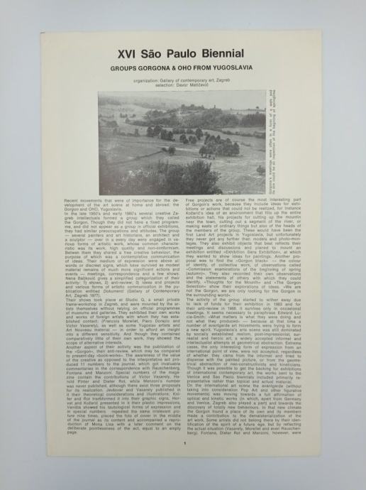 XVI Sao Paulo Biennial katalog 19,5x29,5 koji se rastvara u plakat 39x59 cm. 8p XVI Sao Paulo Biennial: Gorgona Oho Group from Yugoslavia. Museu de Arte Moderna, 1981. Predgovor na engleskom jeziku Davor MatičevićStranica: 8Dimenzije: 20x30Jezik: ZagrebPismo: LatinicaStanje: OdličnoGodina: 1981