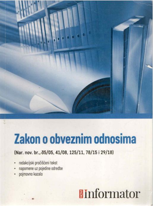 U Narodnim novinama broj 41, od 9. travnja 2008., objavljen je Zakon o izmjenama i dopunama Zakona o obveznim odnosima, koji je stupio na snagu 17. travnja 2008. Tim je Zakonom dotadašnji tekst Zakona o obveznim odnosima, u određenoj mjeri, dopunjen pa smo radi ažurnosti i objedinjavanja teksta Zakona priredili redakcijski pročišćeni tekst Zakona o obveznim odnosima sa željom da na taj način korištenje Zakonom učinimo lakšim i jednostavnijim. U tu su svrhu i sve najnovije izmjene i dopune Zakona o obveznim odnosima otisnute masnim slovima. Uz odredbe u kojima je brisan jedan ili više stavaka, odnosno članaka, navedena je napomena u kojoj je precizirano koji je stavak, odnosno članak brisan. Pojmovno kazalo uz Zakon o obveznim odnosima (Nar.nov., br. 35/05 i 41/08) u ovom je drugom, izmijenjenom i dopunjenom izdanju prošireno i time još više poboljšano.Stranica: 182Jezik: ZagrebPismo: LatinicaStanje: OdličnoUvez: MekiGodina: 2008