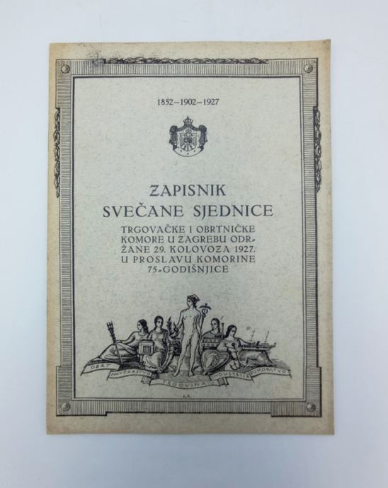 Zapisnik svečane sjednice trgovačke i obrtničke komore u Zagrebu održane 29. kolovoza 1927. u proslavu komorine 75 godišnjice Stranica: 40Dimenzije: 21x29Jezik: ZagrebPismo: LatinicaStanje: DobroUvez: MekiGodina: 1927