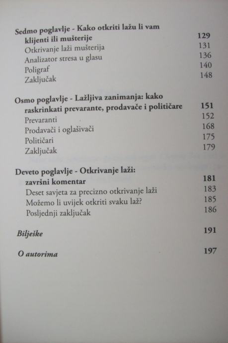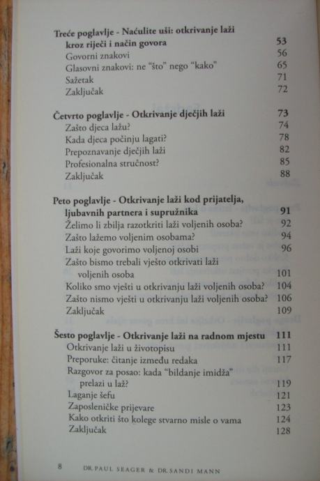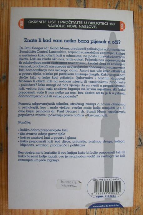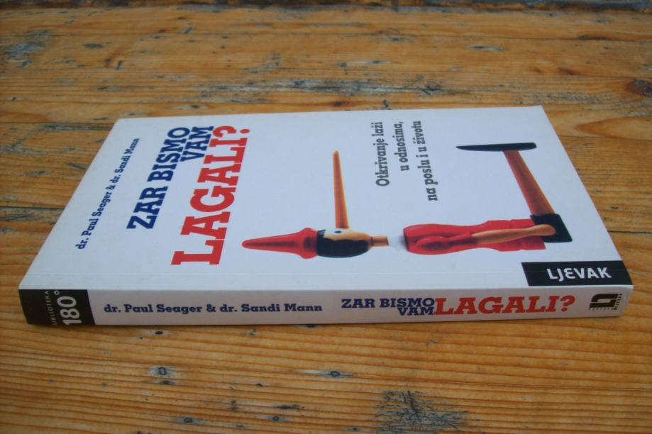 Dr. Paul Seager i dr. Sandi Mann, predavači psihologije na britanskom Sveučilištu Central Lancashire, napisali su neobično zanimljivu knjigu o načinima kako otkriti laži u odnosima, na poslu i u svako-dnevnom životu. Laži su svuda oko nas, tvrde autori. Prijatelji nas uvjeravaju da ih oduševljava naša ekstremna nova frizura, bračni drug se zaklinje u vjernost, prodavači nas zavode nevjerojatnim obećanjima – razne vrste laži bombardiraju nas svakoga dana. Autori nas uče kako otkriti laž u govoru tijela, a kako pri pažljivom slušanju drugih. Kako prepoznati dječje laži, a kako kod prijatelja, ljubavnika i bračnih drugova? Možemo li otkriti laži na radnom mjestu ili «raskrinkati» prodavače i političare? Iako mnogi od nas vjeruju da su vješti u prepoznavanju laži, većina ljudi traži znakove laganja na krivim mjestima. Ali kako prepoznati vuče li nas netko za nos, bez obzira na to je li u pitanju dobronamjerna laž ili velika podvala? Pomoću odgovarajućih tehnika, stručnog znanja o novim otkrićima u psihologiji, kao i malo vježbe, svatko može bolje nanjušiti laž. U ovoj knjizi psiholozi dr. Paul Seager i dr. Sandi Mann razotkrivaju popularne mitove i pokazuju prave načine otkrivanja laži. Naučite: - koliko dobro prepoznajete laži - što stvarno odaje govor tijela - koji su znakovi laži u govoru i glasu - kako prepoznati laži kod djece, prijatelja, bračnog druga, kolega, klijenata, varalica, prodavača i političara Bez obzira na to koristite li ovu knjigu kako bi bolje prepoznali laži ili kako bi sami bolje lagali, ovo je neophodan vodič za svakoga tko želi razumjeti umijeće laganja.