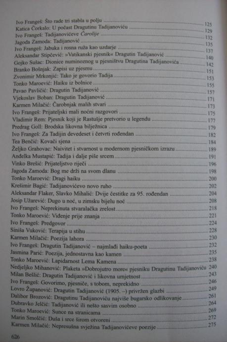 U Zborniku su objavljeni eseji, kritike i novinski članci eminentnih hrvatskih autora o pjesništvu, prozi i prijevodima Dragutina Tadijanovića, barda hrvatskoga pjesništva, objavljivani u časopisnoj periodici i novinskim tiskovinama u razdoblju od 1991. do 2005. Posljednji prilog ovoga Zbornika čine govori kojima su se dužnosnici i crkveni dostojanstvenici te Tadijini prijatelji oprostili s Tadijom na posljednjem ispraćaju 2. srpnja 2007.