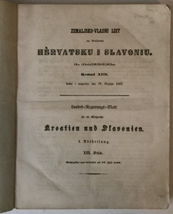 ZEMALJSKO-VLADNI LIST ZA KRALJEVINE HERVATSKU I SLAVONIU, I. RAZDIEL,