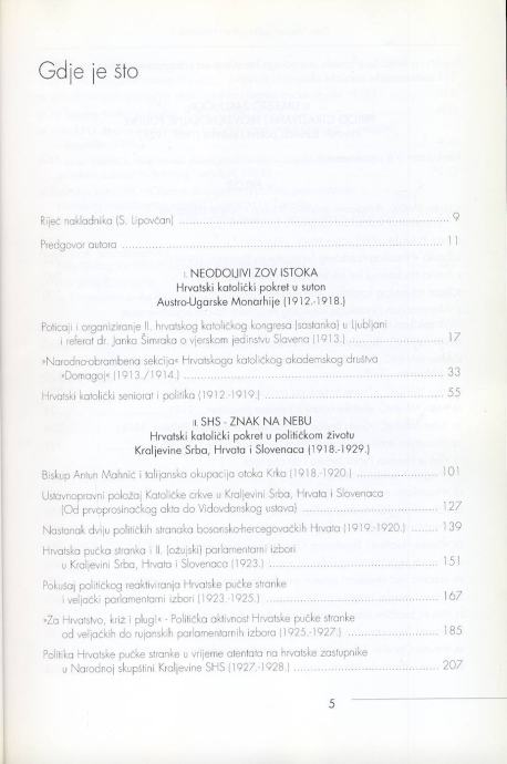 Priozi poznavanju crkveno-nacionalne povijesti Hrvata početkom XX stoljeća. Knjiga kao kuriozitet sadrži posvetu i potpis Tomislava Merčepa. Deveta knjiga Biblioteke "Manualia Universitatis" posvećena je modernoj hrvatskoj povijesti. Knjiga hrvatskog povjesničara, sastavljena od prethodno objavljenih radova razasutih po raznim časopisima, odnosi se na Hrvatski katolički pokret i njegovo političko djelovanje, dakle na hrvatsku crkveno-nacionalnu povijest u prva tri desetljeća XX. stoljeća. Tri su osnovne cjeline: Neodoljivi zov Istoka, Hrvatski katolički pokret u suton Austro-Ugarske Monarhije (1912.-1918.), zatim SHS - Znak na nebu, Hrvatski katolički pokret u političkom životu Kraljevine Srba, Hrvata i Slovenaca (1918.-1929.). te Umjesto zaključka: Prilog istraživanju providencijalne politike, Hrvatski katolički pokret i politika (1903.-1929.). Osobitost knjige čini i trideset relevantnih povijesnih izvora, odnosno dokumenata, objavljenih u prilogu knjige.