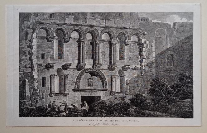 Louis-Francois Cassas i Joseph Lavallée: Zlatna vrata Dioklecijanove palače / Vue d'une porte du palais de Diocletien, Appellee Porta Aurea.Zlatna vrata Dioklecijanove palače - Zlatna vrata sjeverne strane palače bila su najljepša.Veduta iz monumentalnog djela „Voyage pittoresque dell'Istrie et de la Dalmatie“, Pariz, 1802.Bakrorez, uže margineDimenzije bakroreza: 44.5x30Ukupne dimenzije: 53x36Dimenzije: 44.5x30Jezik: ParizPismo: LatinicaStanje: OdličnoGodina: 1802