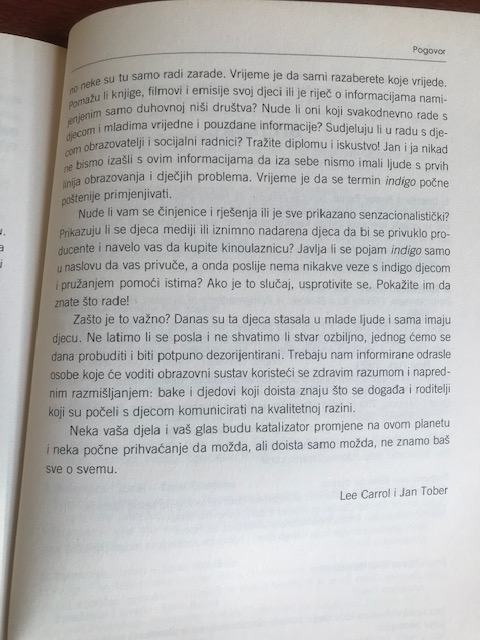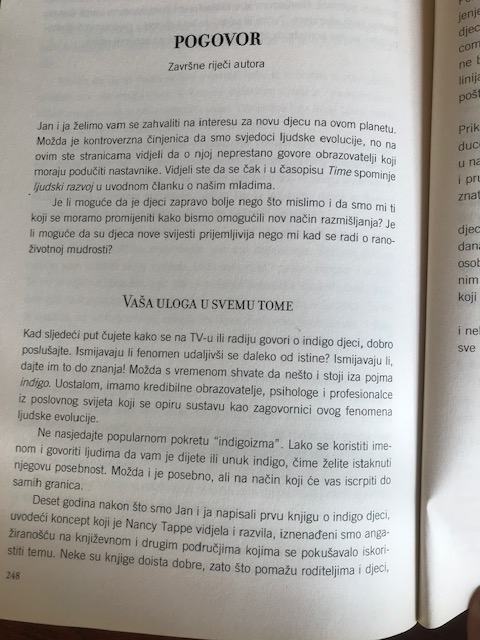 Autori knjige “Indigo djeca” svojim radom zainteresirali su čitav niz stručnjaka za djecu koja su nadarena, kreativna i po mnogo čemu drugačija te kao takva neshvaćena i neprihvaćena od okoline. Počesto se indigo djeca ne snalaze u tradicionalnim sustavima obrazovanja, dok izvanredne rezultate pokazuju pri radu u manjim grupama. Ovu knjigu napisali su roditelji indigo djece, stručnjaci koji su komunicirali s djecom (odgajatelji, nastavnici, psiholozi…) i pratili njihovo odrastanje te sama indigo djeca. Sadržaj ne govori o indigo tinejdžerima, već nam pomoću iskustva roditelja i indigo djece pomaže u boljem razumijevanju različitosti najmlađe indigo generacije. Različiti autori predlažu niz savjeta kako prilagoditi obrazovanje i liječenje, zaslužiti njihovo povjerenje ili provoditi slobodno vrijeme i uživati u njihovoj posebnosti.(iz tiska)