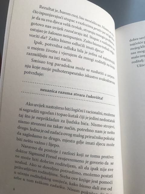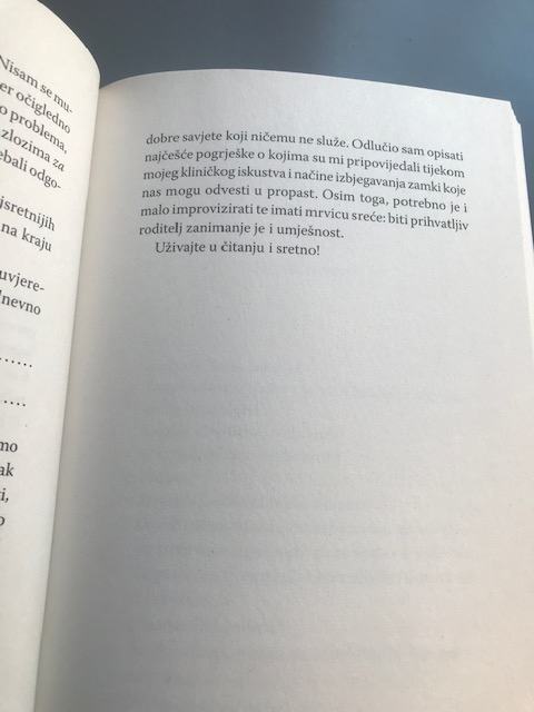 Ovo nezaobilazno štivo za svakog svjesnog i savjesnog roditelja utemeljeno je na suvremenom, znanstvenom pristupu, obogaćenom osebujnim autorovim stilom, humorom i brojnim primjerima iz kliničke prakse. Uz mnoge posebnosti, knjiga ima i tu da obuhvaća širok raspon – od odluke da se ima dijete pa sve do adolescencije i djetetova osamostaljenja.