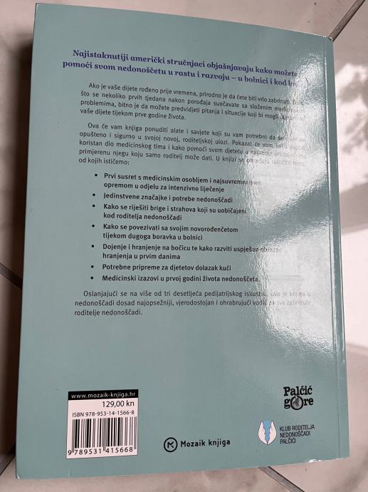 Ova će vam knjiga ponuditi alate i savjete koji su vam potrebni da se osjećate opušteno i sigurno u svojoj novoj, roditeljskoj ulozi. Pokazat će vam kako postati koristan dio medicinskog tima i kako pomoći svom djetetu u napretku pružajući mu primjerenu njegu koju samo roditelj može dati. U knjizi se obrađuju različite teme, od kojih ističemo: Prvi susret s medicinskim osobljem i najsuvremenijom opremom u odjelu za intenzivno liječenje Jedinstvene značajke i potrebe nedonoščadi Kako se riješiti brige i strahova koji su uobičajeni kod roditelja nedonoščadi Kako se povezivati sa svojim novorođenčetom tijekom dugoga boravka u bolnici Dojenje i hranjenje na bočicu te kako razviti uspješan obrazac hranjenja u prvim danima Potrebne pripreme za djetetov dolazak kući Medicinski izazovi u prvoj godini života nedonoščeta.