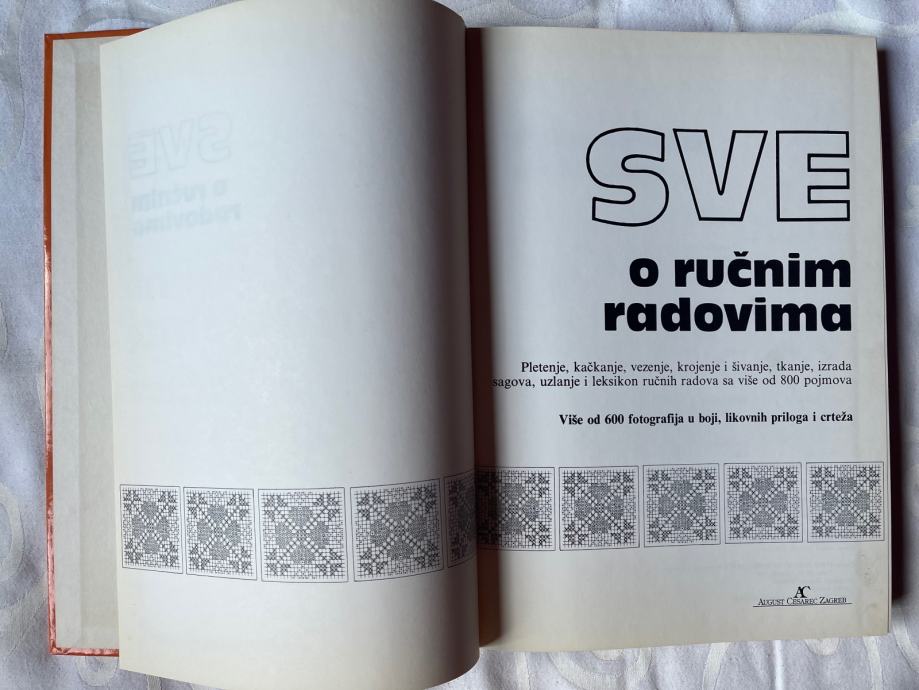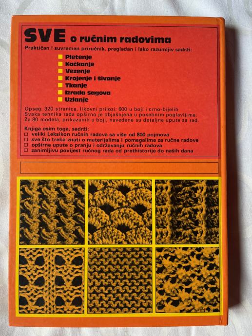 Pletenje, kačkanje, vezenje, krojenje i šivanje, tkanje, izrada sagova, uzlanje i leksikon ručnih radova sa više od 800 pojmova. Više od 600 fotografija u boji, likovnih priloga i crteža.