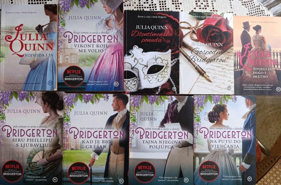 Prodajem komplet knjiga o obitelji Bridgerton (autorica Julia Quinn) koji se sastoji od osam knjiga plus epilog (deveta knjiga) - Živjeli su dugo i sretno. Knjige su pročitane, no u dobrom stanju. Nisu sve isto izdanje.