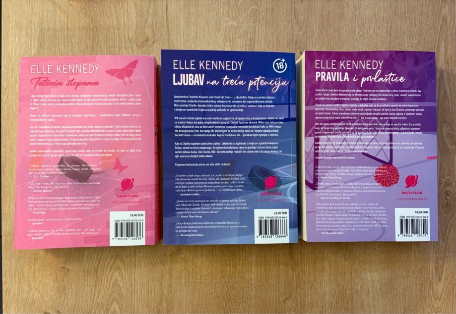 Prodajem lot od tri knjige autorice Elle Kennedy iz popularnog serijala Off-Campus, sve na hrvatskom jeziku. Radi se o sljedećim naslovima: Tatinim stopama, Ljubav na treću potenciju i Pravila i povlastice. Sve tri knjige izdala je naklada Neptun. Prva knjiga ima oznake markerom na nekoliko stranica, druge dvije nove