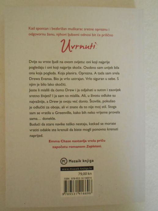 Prodajem knjigu "Uvrnuti" autorice Emme Chase u izdanju "Mozaik knjige", meki uvez. Knjiga je nova (inače drugi dio serije romana "Zapleteni"; (tetralogija: Zapleteni, Uvrnuti, Ukroćeni, Povezani)).