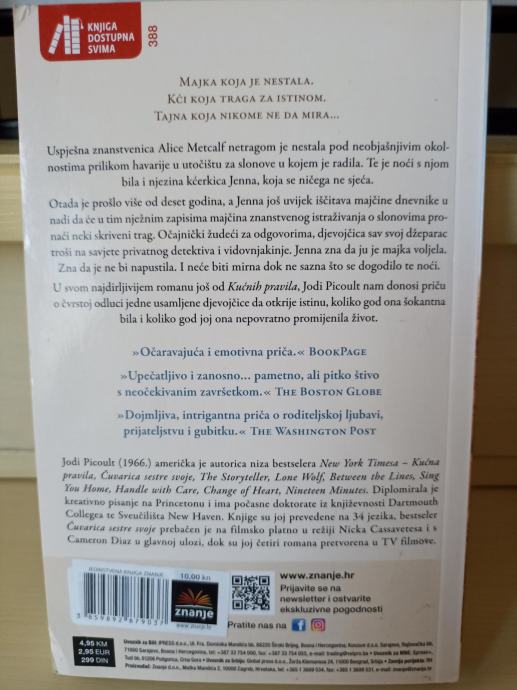 Majka koja je nestala. Kći koja traga za istinom. Tajna koja nikome ne da mira… Uspješna znanstvenica Alice Metcalf netragom je nestala pod neobjašnjivim okolnostima prilikom havarije u utočištu za slonove u kojem je radila. Te je noći s njom bila i njezina kćerkica Jenna, koja se ničega ne sjeća. Otada je prošlo više od deset godina, a Jenna još uvijek iščitava majčine dnevnike u nadi da će u tim nježnim zapisima majčinog znanstvenog istraživanja o slonovima pronaći neki skriveni trag. Očajnički žudeći za odgovorima, djevojčica sav svoj džeparac troši na savjete privatnog detektiva i vidovnjakinje. Jenna zna da ju je majka voljela. Zna da je ne bi napustila. I neće biti mirna dok ne sazna što se dogodilo te noći. U romanu Vrijeme rastanka Jodi Picoult nam donosi dirljivu priču o čvrstoj odluci jedne usamljene djevojčice da otkrije istinu, koliko god ona šokantna bila i koliko god joj ona nepovratno promijenila život.