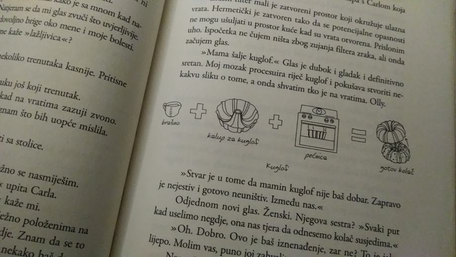 Međutim, jednog dana se ispred susjedne kuće pojavio kamion za selidbe. Pogledala sam kroz prozor i ugledala njega. Visok je, mršav i sav u crnom – crna majica, crne traperice, crne tenisice i crna kapa koja mu potpuno prekriva kosu. Zamijetio me kako virim kroz prozor i uzvratio pogled. Gledali smo se bez treptanja. Nisam mogla skrenuti pogled. Zove se Olly.