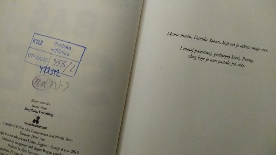Prodajem knjigu „Sve, baš sve", prijevod djela: Everything, everything, autorica Nicola Yoon, ilustracije David Yoon,