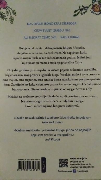 Ovo je priča o tajnama, lažima, ljubavi i otkriću. Način na koji autorica opisuje Madelinein svijet pomoću prekrasnih slika tjera čitatelja da cijeni male stvari u životu. Zaista, ali zaista preporučujem ovaj roman jer ima najbolju priču ikad i fantastičan završetak te definitivno vrijedi uzeti ovu knjigu u ruke. Ako ste ljubitelji knjiga poput Greška u našim zvijezdama, Ako ostanem i Prije nego umrem, onda je ovo prava knjiga za vas.