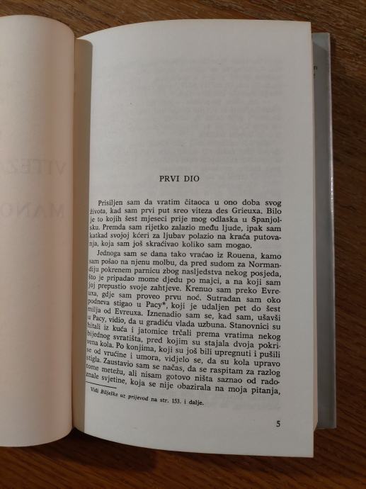 Priča, smještena u Francusku i Louisianu početkom 18. stoljeća, prati junaka, Chevaliera des Grieuxa, i njegovu ljubavnicu, Manon Lescaut. Kontroverzno u svoje vrijeme, djelo je zabranjeno u Francuskoj nakon objavljivanja. Unatoč tome, postao je vrlo popularan, a piratska izdanja bila su široko distribuirana. U sljedećem izdanju iz 1753., Abbé Prévost ublažio je neke skandalozne pojedinosti i ubacio više moralizirajućih odricanja od odgovornosti. Djelo je postalo najtiskanija knjiga u francuskoj književnosti, s više od 250 izdanja objavljenih između 1731. i 1981.