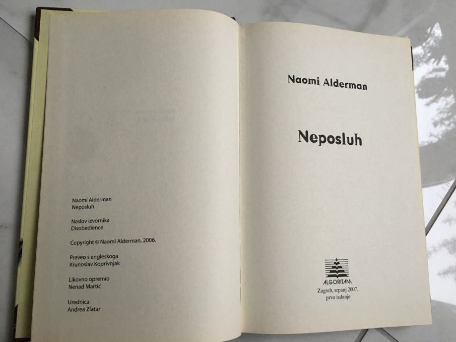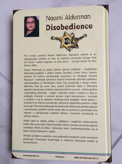 „U 'Neposluhu' Alderman pokušava pomiriti judaizam, emancipaciju žena i lezbijstvo (u Tori se ne spominje lezbijstvo; rabini ga zabranjuju; ali u Tori piše jedino o muškarcima koji liježu s drugim muškarcima!). Ideja se čini suludom, ali nije nezanimljiva: tradicionalno i liberalno mogu se mješati na začudne načine. Autorica i samu sebe smatra praktičnom vjernicom. U vrijeme šabata ne koristi se automobilom, telefonom ili e-mailom, ne koristi novac i priprema košer-hranu... Prema vjeri je kritička - ono što je muči jest odnos vjere prema ženama. Ali i afirmativna, u tradiciji nalazi uporište: 'Ne mogu biti ortodoksna Židovka. Nemam to u sebi niti sam ikad to imala. No, jednako tako ne mogu i ne biti.'“ (Dragan Jurak)