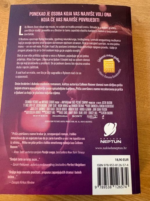Prodajem novu knjigu Priča završava s nama autorice Colleen Hoover, izdanje naklade Neptun na hrvatskom jeziku. Radi se o ljubavnom romanu koji prati priču o Lily Bloom i njezinim životnim izborima, poznat i kao predložak za istoimeni filmski hit s Blake Lively.