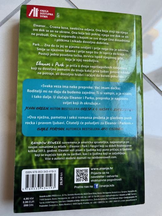 Eleanor… Crvena kosa, neobična odjeća. Ona koja stoji iza njega sve dok se on ne okrene. Ona koja leži pokraj njega sve dok se on ne probudi. Ona, u usporedbi s kojom se sve druge čine dosadnima i plitkima i nikada dovoljno dobrima. Park… Zna da će joj se pjesma svidjeti i prije nego što je odsvira. Smije se njezinim šalama i prije nego što ih uopće ispriča do kraja. Postoji mjesto na njegovim grudima, mrvicu ispod grla, koje je njoj neodoljivo. Ljubavna priča “Eleanor i Park” iz pera suvremene američke spisateljice Rainbow Rowell govori o dvoje neprilagođenih tinejdžera koji su dovoljno pametni da znaju kako prva ljubav gotovo nikada ne potraje, ali dovoljno hrabri i očajni da barem pokušaju.