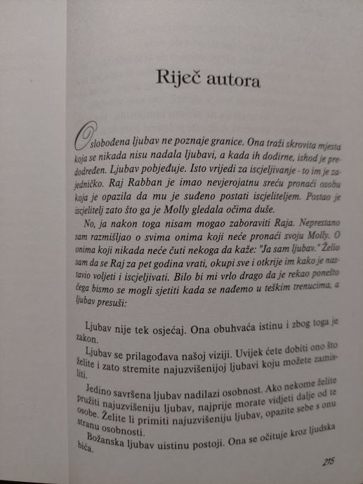 Roman o mladom liječniku Raju iz Indije koji se nalazi pred ženidbom s Mayom. Iako Raj živi u Americi, brak je sklopio na tradicionalan indijski način u kojem su bračni supružnici izabrani još u djetinjstvu. Rajeva se situacija mijenja kad se neočekivano zaljubi u Molly i počne doživljavati neke od najsretnijih trenutaka u svom životu. Mollyna smrt duboko će ga potresti, ali i uvjeriti da je potreba za srodnom dušom najdublja ljudska potreba a ne tek romantična maštarija. Roman Deepaka Chopre konvencionalno je ljubavno štivo napisano prema obrascima tog žanra. Pouka o postojanju beskonačne božanske ljubavi koja proizlazi iz duše i nadživljuje smrt, osnovni je tematski okvir ovoga djela.