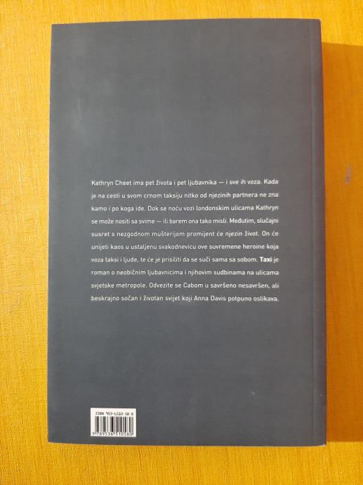 Kathryn Cheet ima pet života i pet ljubavnika – i sve ih voza. Kada je na cesti u svom crnom taksiju nitko od njezinih partnera ne zna kamo i po koga ide. Dok se noću vozi londonskim ulicama Kathryn se može nositi sa svime – ili barem ona tako misli. Međutim, slučajni susret s nezgodnom mušterijom promijenit će njezin život. On će unijeti kaos u ustaljenu svakodnevnicu ove suvremene heroine koja voza taksi i ljude, te će je prisiliti da se suoči sama sa sobom. Taxi je roman o neobičnim ljubavnicima i njihovim sudbinama na ulicama svjetske metropole. Odvezite se Cabom u savršeno nesavršen, ali beskrajno sočan i životan svijet koji Anna Davis potpuno oslikava. Njezin dar za nadrealno i fabulativno te sposobnost da posve zaokupi čitateljevu pažnju odvest će je daleko. Amanda Craig The Times Treći roman Anne Davis učinit će sve nove puritance ponosnima… – Kate Kellaway, Guardian