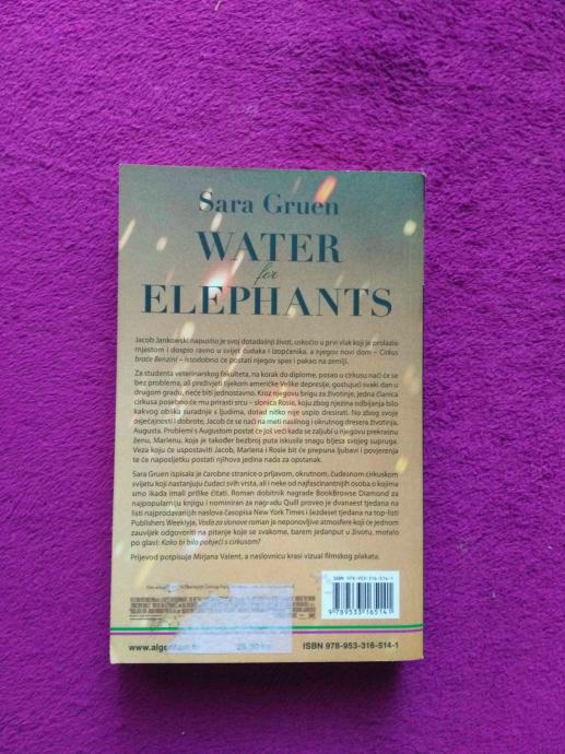 Sara Gruen ispisala je čarobne stranice o prljavom, okrutnom, čudesnom cirkuskom svijetu koji nastanjuju čudaci svih vrsta, ali i neke od najfascinantnijih osoba o kojima smo ikada imali prilike čitati. Roman dobitnik nagrade BookBrowse Diamond za najpopularniju knjigu i nominiran za nagradu Quill proveo je dvanaest tjedana na listi najprodavanijih naslova časopisa New York Times i šezdeset tjedana na top-listi Publishers Weeklyja, Voda za slonove roman je neponovljive atmosfere koji će jednom zauvijek odgovoriti na pitanje koje se svakome, barem jedanput u životu, motalo po glavi: Kako bi bilo pobjeći s cirkusom?