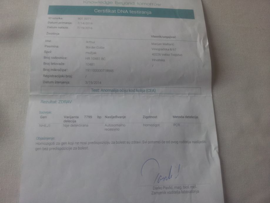 Kukovi hd-a,dna negativan.Do sada je Arthur imao 3 legla,sveukupno 26 potomaka(9,8,9)