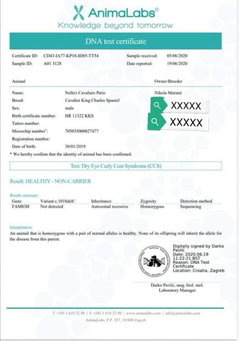 100% zdrav parnjak i zdravih krvnih linija svojih predaka! Čistih DNA linija i odličnih izložbenih uspjeha svojih bližih i daljnjih predaka, što je sve nabrojano i vidi se u rodovniku ovoga mužjaka.