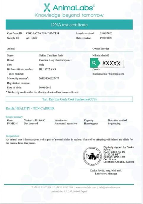 ➡️Ovaj pas je uzgojno-izložbeni parnjak sa zatvorenim šampionatom "Mladi šampion u ljepoti Hrvatske" (oštenjen - 30.01.2019.) , sa rodovnikom i uzgojnom dozvolom, te obavljenim zdravstvenim pregledima srca, oči, patela, kao i DNA testom, za što posjeduje komplet medicinsku dokumentaciju, dok za DNA test posjeduje CERTIFICATE CCS + EFS = Not deteected = clear ! CCS+EFS clear je i od strane oba svoja roditelja kao i od strane svih 4 svojih djedova i baka, što se vidi u rodovniku.