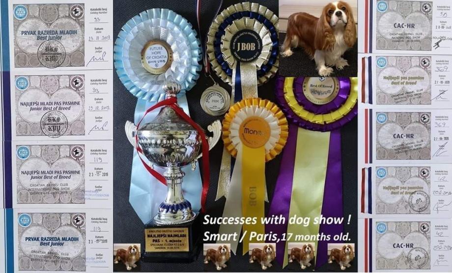 Od svog šestog mjeseca, redovito posjećuje i sudjeluje u natjecanjima na izložbama pasa, kako državnim, tako i međunarodnim ( CAC i CACIB) . S obzirom na njegove pretke ali i na njegove uspjehe sa dosadašnjih izložba pasa, sa sigurnošću se za ovog parnjaka može reći da je zvijezda u usponu, sa do sada ostvarenim uspjesima na izložbama i to :