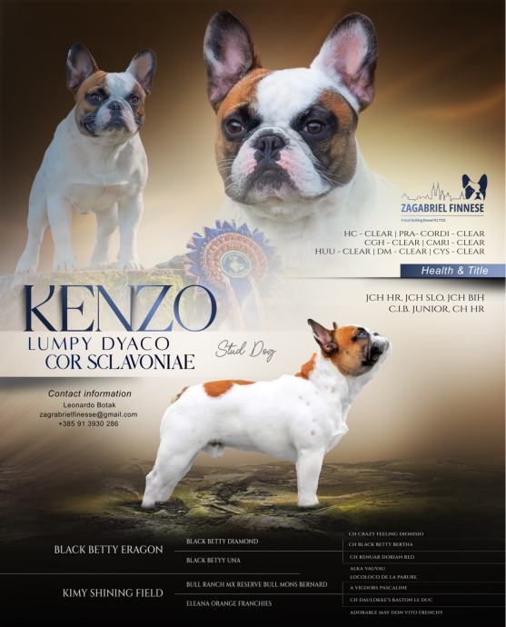 Kenzo je 2 godine star francuski buldog s vrhunskim pedigreom, besprijekornim zdravljem i uspješnom izložbenom karijerom. Svojom građom i izbalansiranim temperamentom ističe se kao pravi predstavnik svoje pasmine.