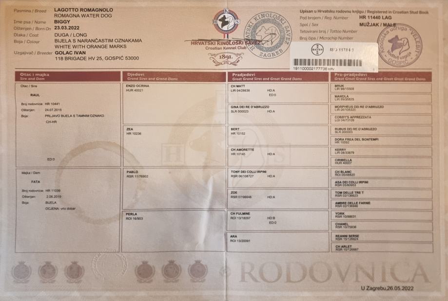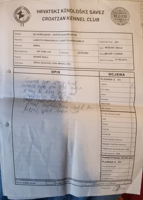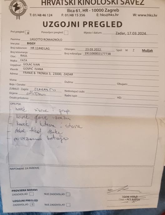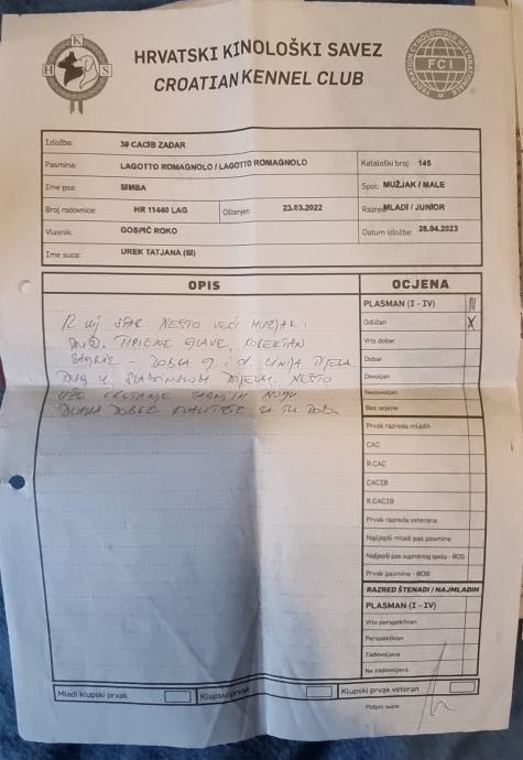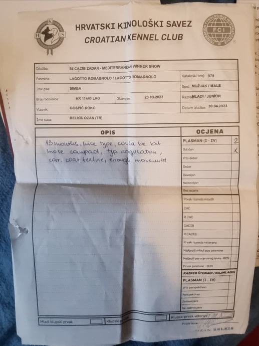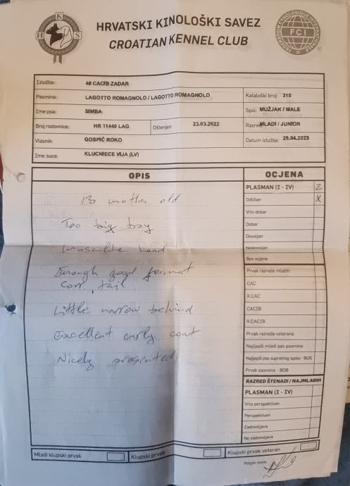 Lagotto Romagnolo idealan mužjak za sve vrste ženki!!! Izvrstan pedigre. Odličnih dimenzija. Dolazi iz porodice šampiona hrvatske (otac). Svi papiri uredni. Sudjelovao je na natjecanju mladih pasa prošle godine. Uzgojna dozvola napravljena 2024. godine.