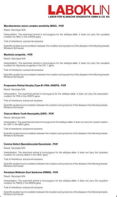 Testiran je na 6 genetskih testova (LABOKLIN paket od 6 testova za patuljastog šnaucera), na svih 6 je N/N (negativan).