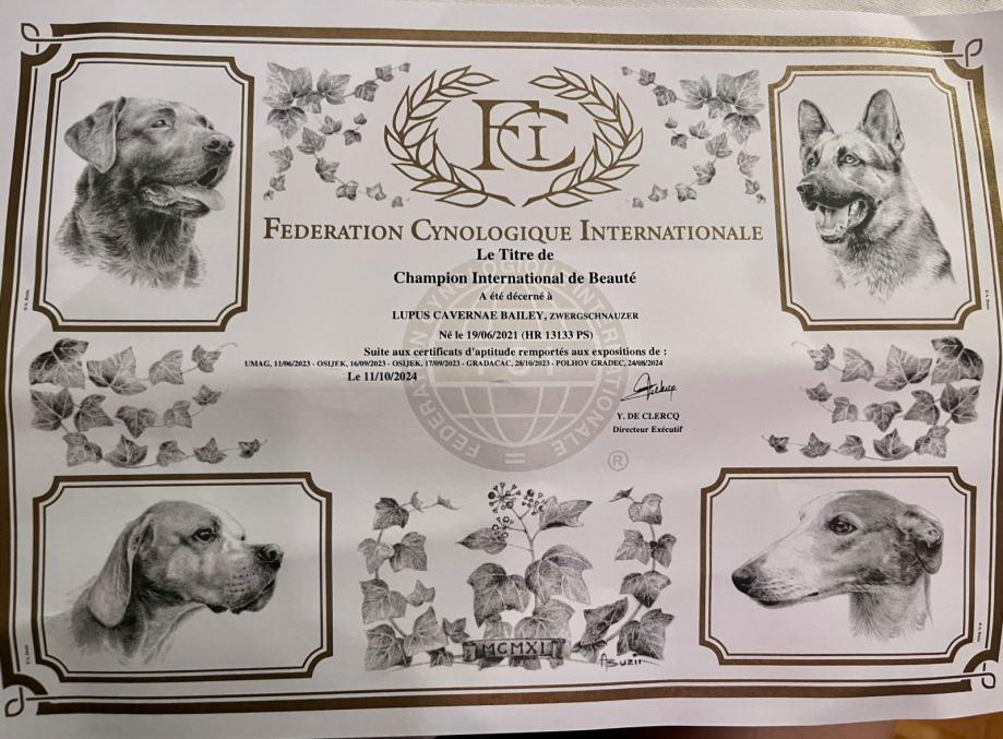 Internacionalni šampion, Grand šampion Hrvatske, šampion BiH, šampion Srbije, Grand šampion Srbije, višestruko osvojene BOB i BOS titule, raspoloživ je za parenje.