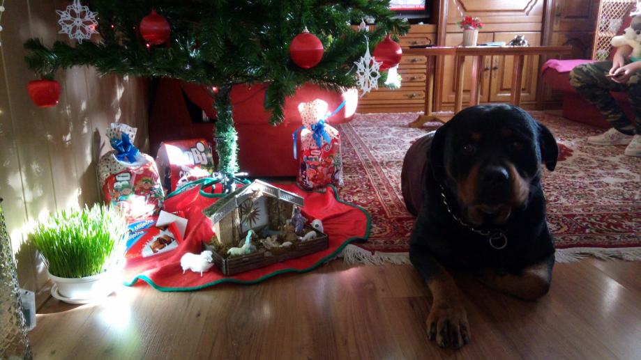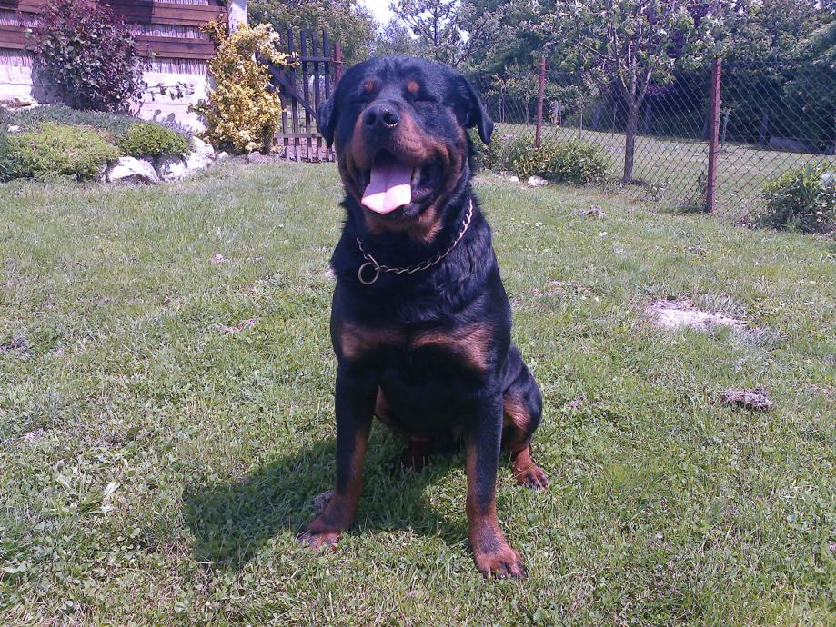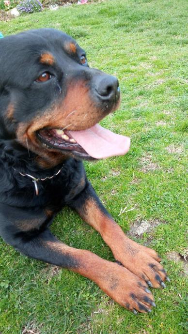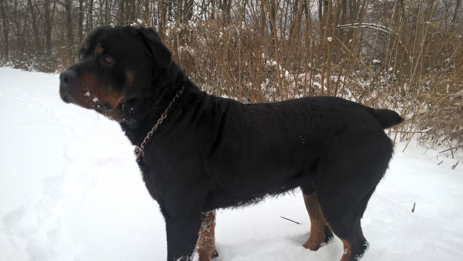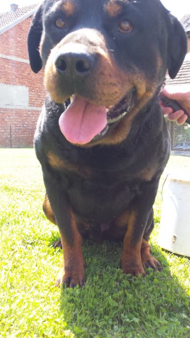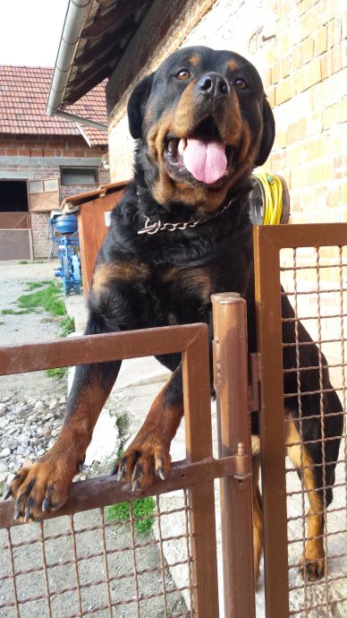 Rocky, rottweiler mužjak, vrhunskog podrijetla, čistokrvan, uredno cijepljen, odličnih osobina i proporcija (visina grebena 65 cm, težina 50 kg), snažan, poslušan, socijaliziran, s iskustvom u parenju (na posljednje 3 slike je Rocky kao štene)